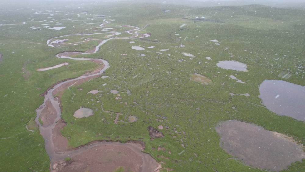 風雪彌漫中的當曲濕地(7月24日攝,無人機照片)。新華社記者 劉詩平 攝