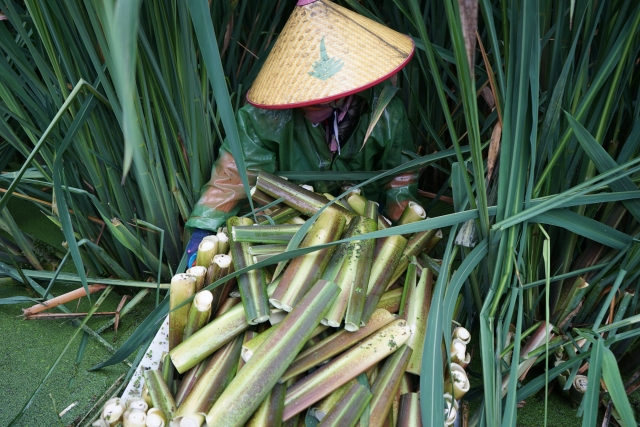 走到田間,只見十余名務(wù)工人員腳穿水鞋,頭頂斗笠,手拿彎刀向下一揮,再去頭割尾,一顆光潔的茭白便采割完成了。采割好的茭白在岸邊經(jīng)過簡(jiǎn)單清洗后,便運(yùn)往冷庫(kù)包裝,銷往各地。