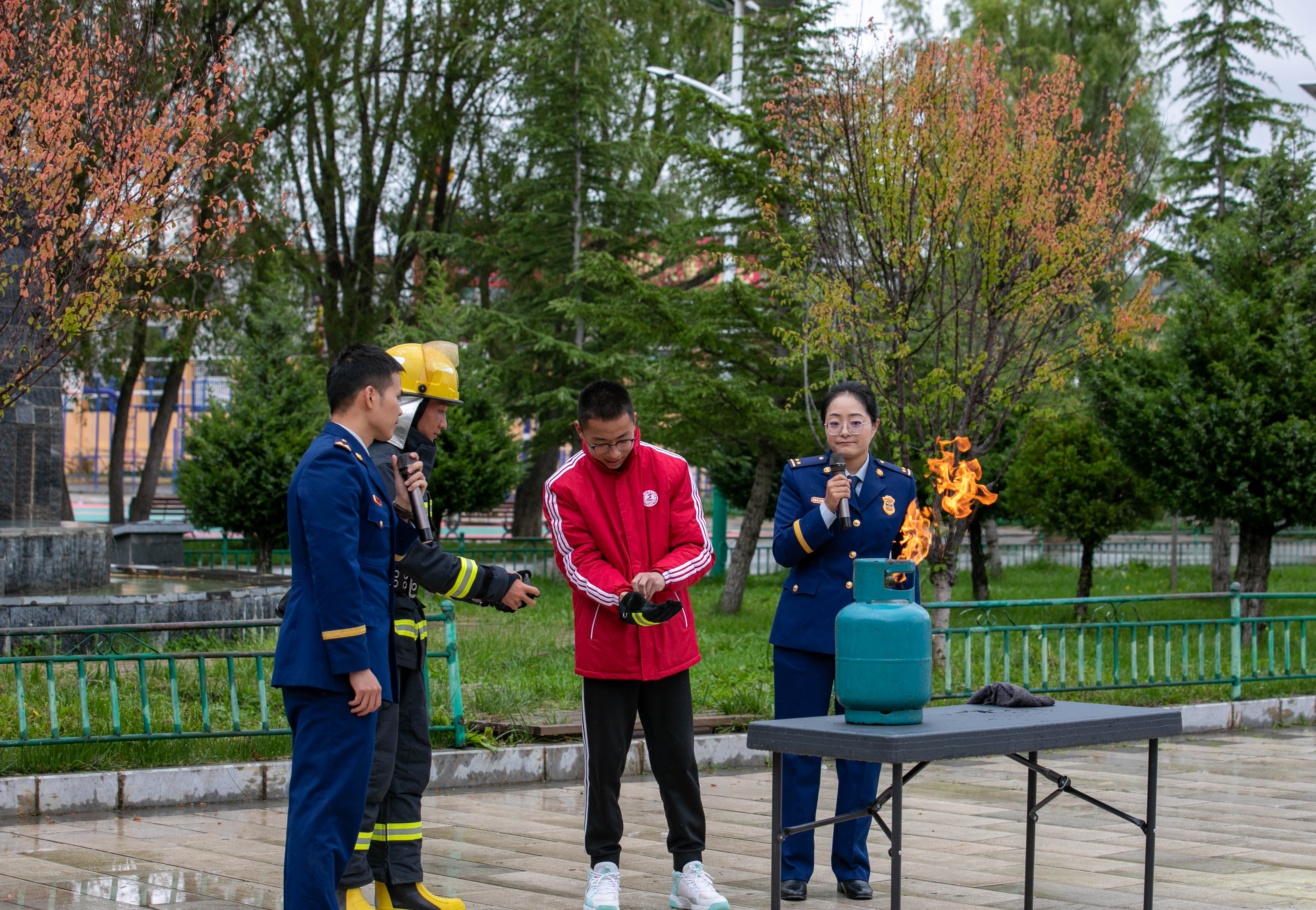 其間,支隊(duì)宣傳員還帶領(lǐng)學(xué)生們 “零距離”參觀體驗(yàn)消防車輛和器材裝備,對(duì)搶險(xiǎn)救援車、液壓破拆系統(tǒng)、手抬機(jī)動(dòng)泵等消防器材裝備進(jìn)行現(xiàn)場講解,讓師生了解器材裝備的用途和使用方法。活動(dòng)中還開展了真火撲救實(shí)操演練及應(yīng)急疏散逃生實(shí)戰(zhàn)演練。