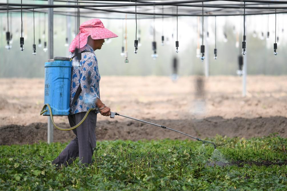 9月4日,工作人員在瀘定縣德威鎮(zhèn)馬鈴薯原原種繁育基地澆水。新華社記者 胥冰潔 攝