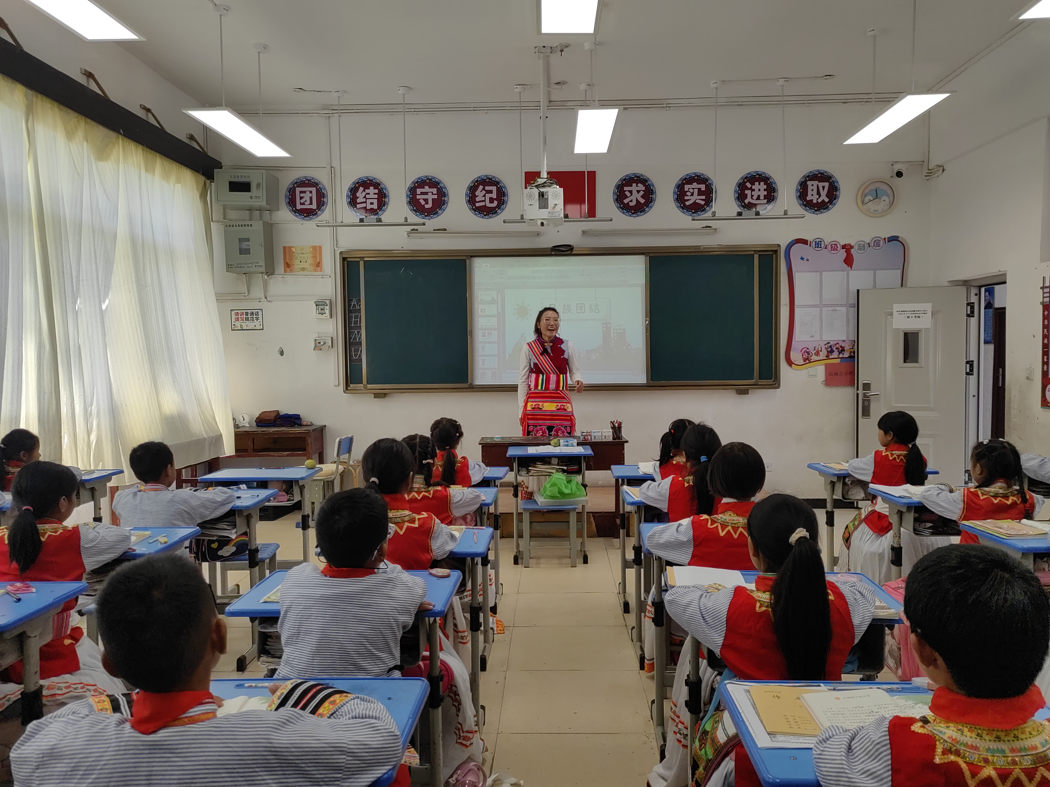 以宣傳為起點(diǎn),對(duì)學(xué)生進(jìn)行民族團(tuán)結(jié)進(jìn)步教育。結(jié)合道德與法治課(思政課)和其他課程把民族團(tuán)結(jié)教育有機(jī)地融合到課堂教學(xué)中。在學(xué)生中積極開展好“七個(gè)一”活動(dòng),即:開設(shè)一堂民族文化課程,教授一項(xiàng)民族文化技能,舉辦一場(chǎng)民族文化講座,組建一個(gè)民族文化樂(lè)團(tuán),教唱一首民族雙語(yǔ)歌曲,開展一次民族文化活動(dòng),形成一種學(xué)校教育特色。