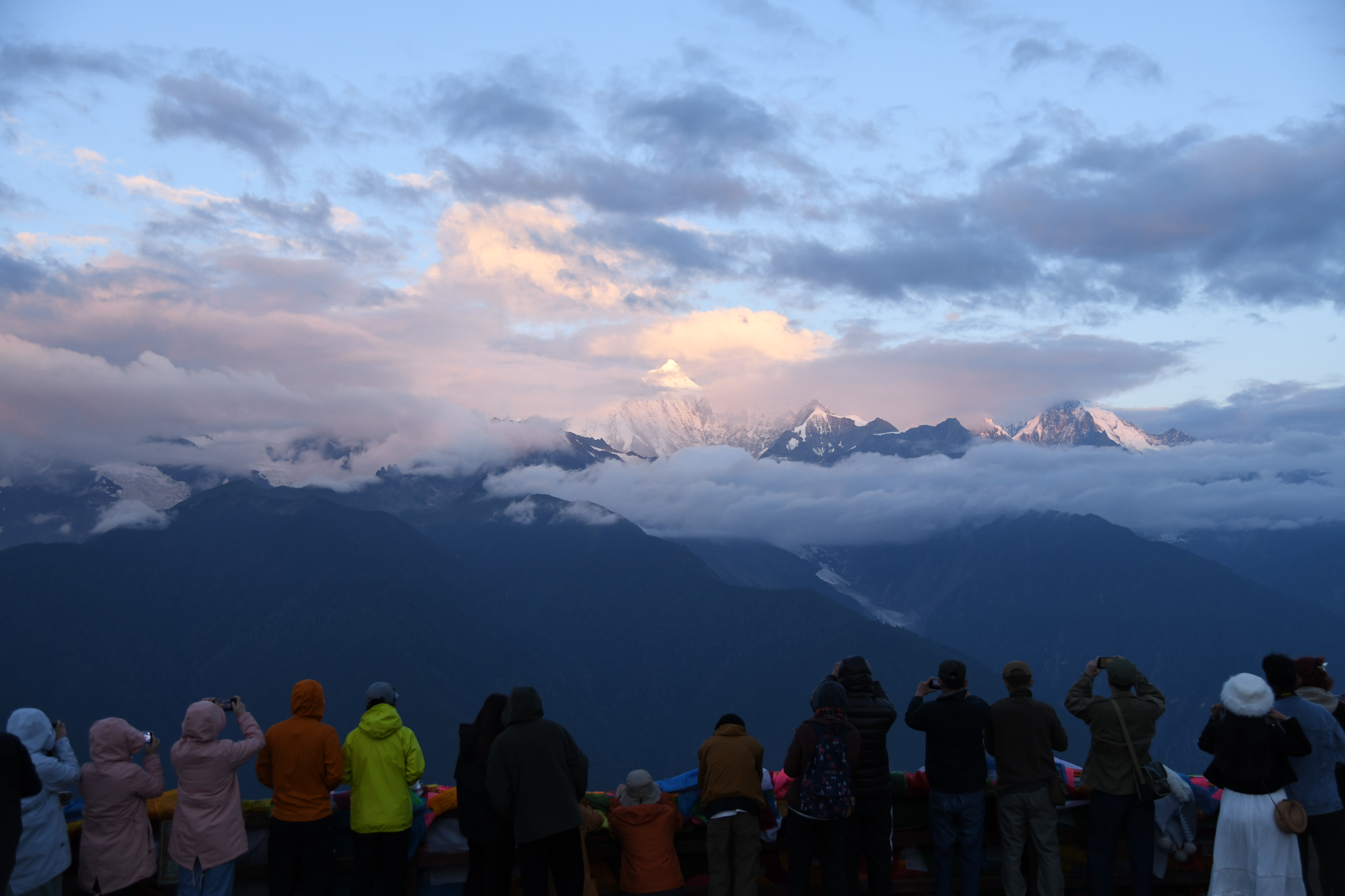 入秋以來,秋風(fēng)撩開縈繞在梅里雪山周圍的云霧,也迎來了觀賞“日照金山”的最佳時(shí)節(jié)。每天清晨6點(diǎn)左右,大批游客就開始蹲守,只為一睹梅里雪山“日照金山”的奇觀。圖為游客觀賞并記錄“日照金山”奇觀。