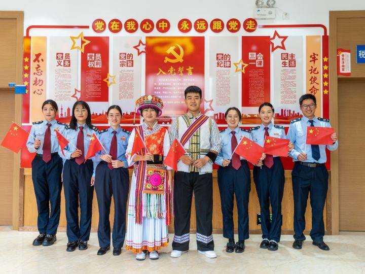 圖為在國(guó)家稅務(wù)總局維西傈僳族自治縣稅務(wù)局,傈僳族稅務(wù)干部身著民族服飾與其他稅務(wù)干部歡慶祝中華人民共和國(guó)成立74周年