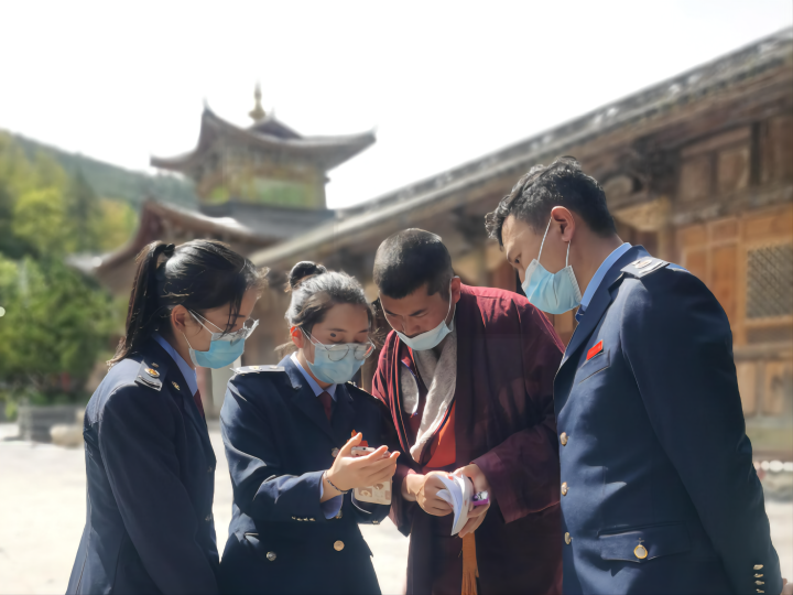 圖為縣稅務(wù)局“傈鄉(xiāng)稅宣小分隊(duì)”上門為壽國(guó)寺的藏傳佛教僧眾開展城鄉(xiāng)“兩險(xiǎn)”手機(jī)繳納流程輔導(dǎo)和民族團(tuán)結(jié)進(jìn)步相關(guān)知識(shí)宣傳。