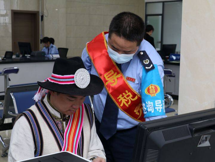 圖為在國(guó)家稅務(wù)總局維西傈僳族自治縣稅務(wù)局辦稅服務(wù)大廳,導(dǎo)稅員為前來辦理申報(bào)業(yè)務(wù)的傈僳族納稅人提供雙語業(yè)務(wù)輔導(dǎo)服務(wù)