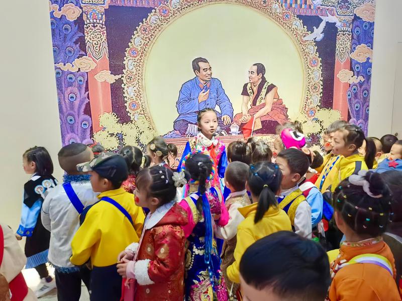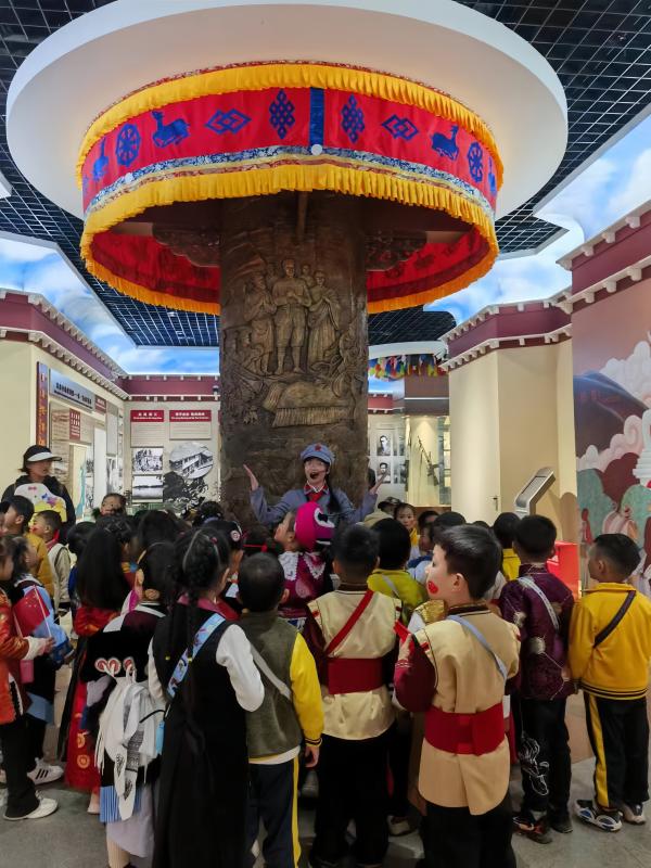 展館內(nèi),“格?;ㄐ⌒≈v解員”進行著生動地講解,通過一件件文物、一幅幅圖片、一個個互動景觀訴說雪域高原上的紅色歷史,引導小朋友們體悟那段不平凡的崢嶸歲月,在行走的課堂里收獲知識和成長。