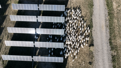 在深藍色的光伏板下,郁郁蔥蔥的牧草向上生長,園區(qū)里的“光伏羊”啃食青草,奔跑追逐,成為當?shù)匾瞬毮康娘L景。
