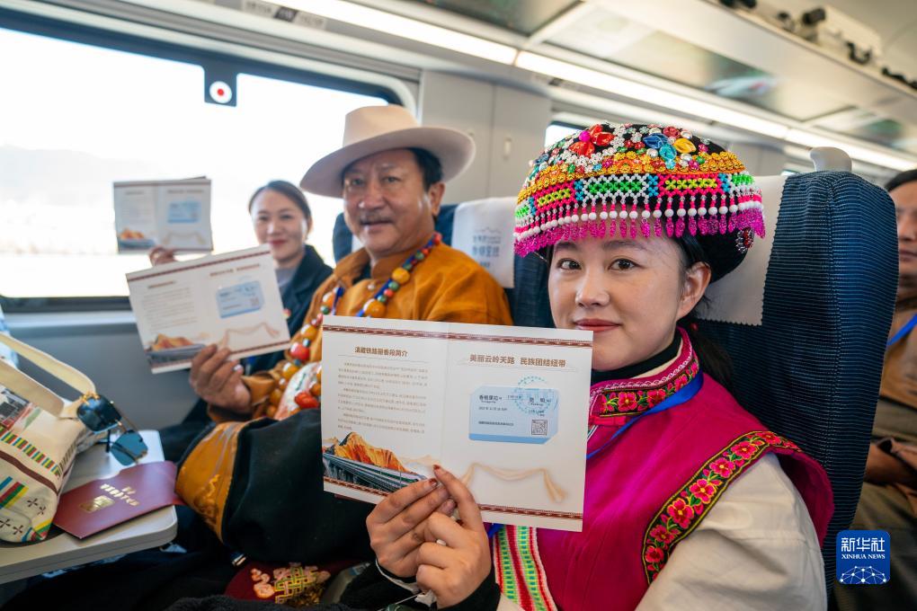 11月26日,乘坐麗香鐵路開通首發(fā)列車的嘉賓在車廂內(nèi)展示紀念車票。新華社記者 陳欣波 攝