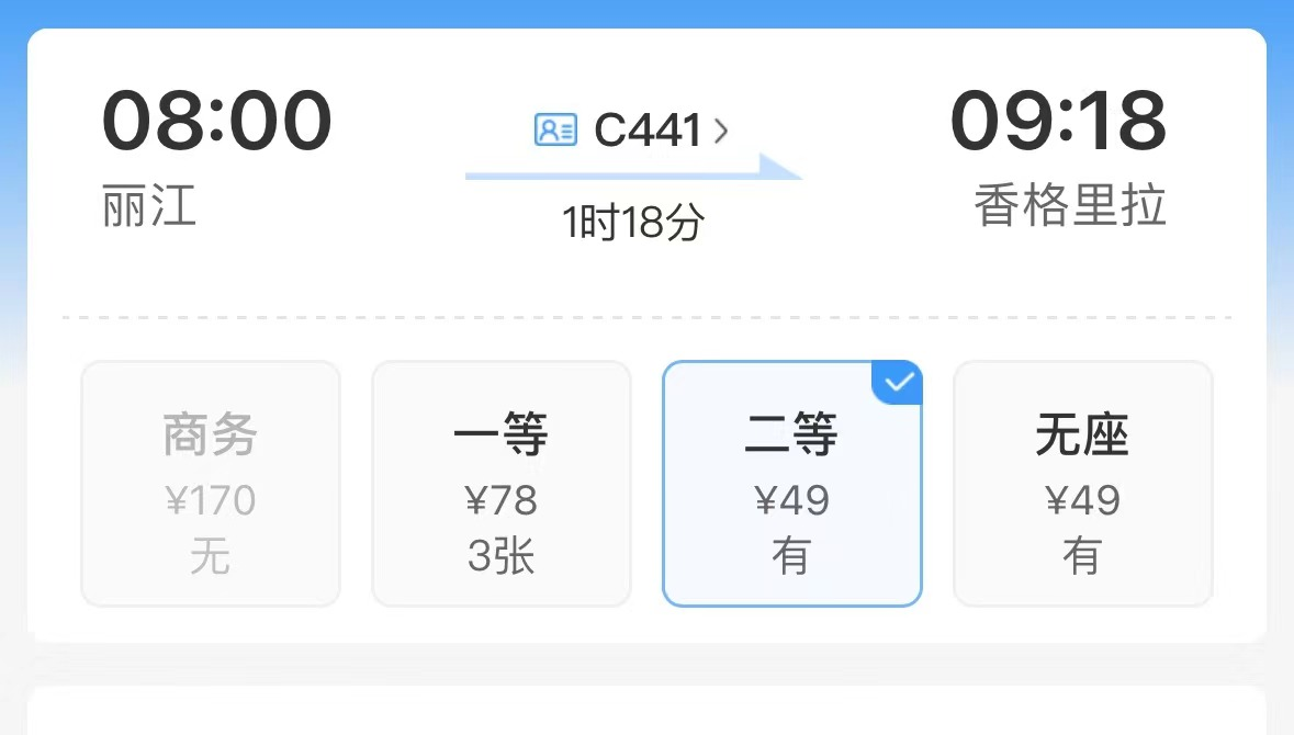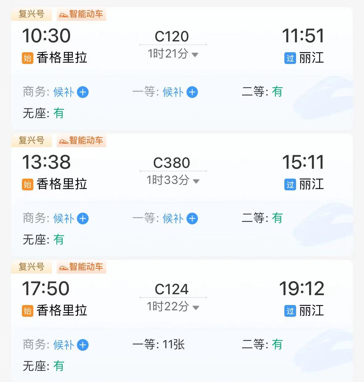 麗香鐵路開通至今熱度較高,鐵路12306購票平臺顯示,多趟班次已出現(xiàn)坐票售罄或無票的情況。根據(jù)香格里拉站工作人員建議,為保證沿線其他車站乘客購票,APP票量實(shí)時(shí)變動(dòng)更新,建議買不到票的乘客實(shí)時(shí)刷新APP,買不到坐票的乘客可以上車后向乘務(wù)員詢問各車廂是否有空余座位。