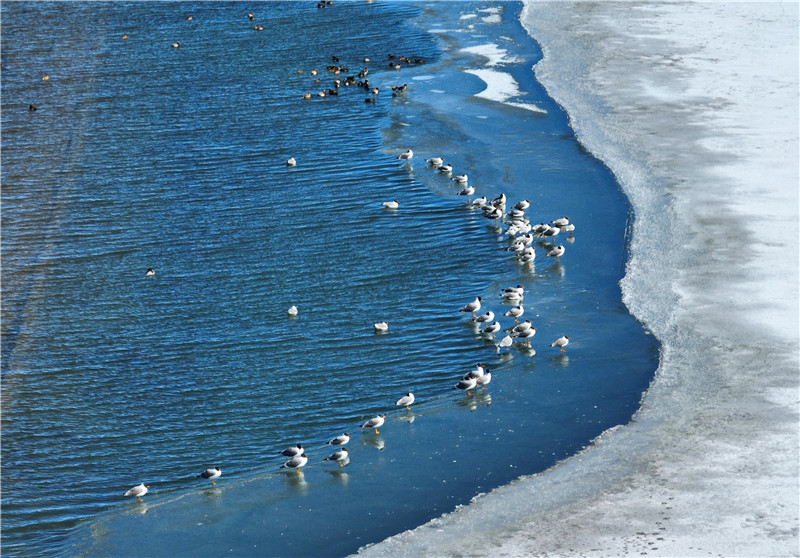 魚鷗在結冰的青海湖邊覓食。郭輝忠 攝