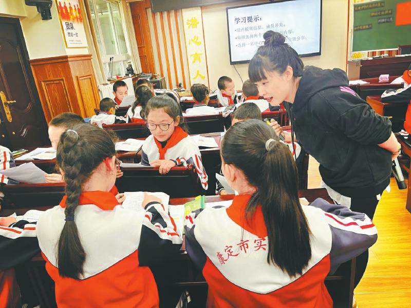 9月20日,在康定市實(shí)驗(yàn)小學(xué),都江堰市支教教師(右一)指導(dǎo)學(xué)生閱讀。