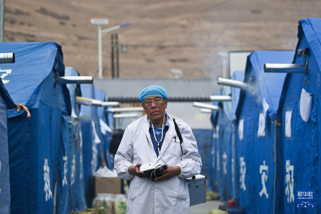 積石山6.2級(jí)地震發(fā)生后,青海省海東市循化撒拉族自治縣道幃藏族鄉(xiāng)牙木村部分房屋出現(xiàn)損毀,當(dāng)?shù)卣谝粫r(shí)間在牙木村建設(shè)安置點(diǎn)。因?yàn)槟贻p時(shí)就讀于衛(wèi)生學(xué)校、掌握基本的醫(yī)療技能,60歲的完么仁增成為安置點(diǎn)的義務(wù)衛(wèi)生員,為村民量血壓并普及健康知識(shí)?!拔蚁胱鲂┝λ芗暗氖聨椭l(xiāng)親們?!蓖昝慈试稣f。
