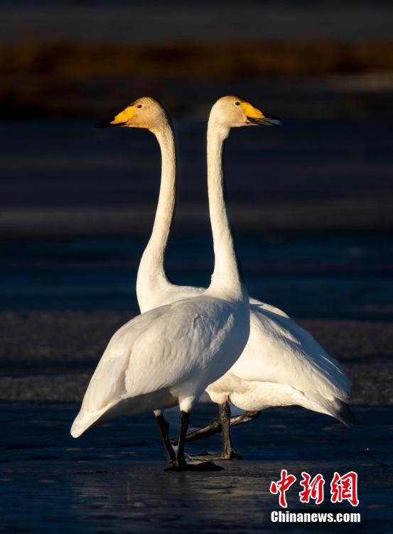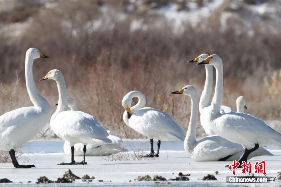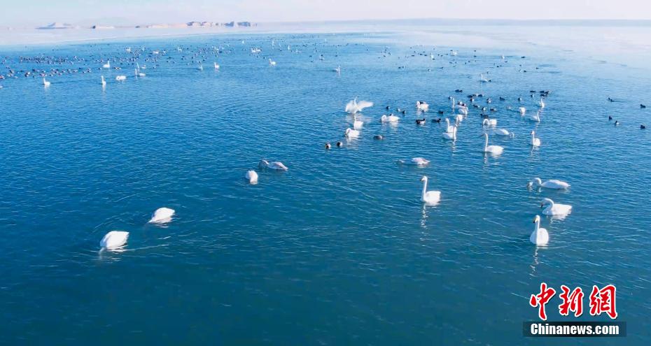 多只天鵝在湖冰上嬉戲。青??婶斂撕?托素湖省級自然保護(hù)區(qū) 供圖