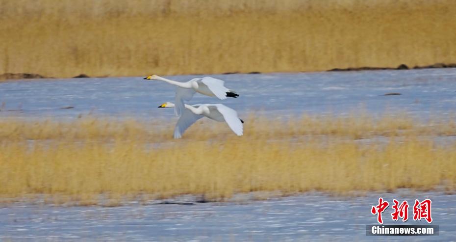 天鵝在空中飛翔。青??婶斂撕?托素湖省級自然保護(hù)區(qū) 供圖