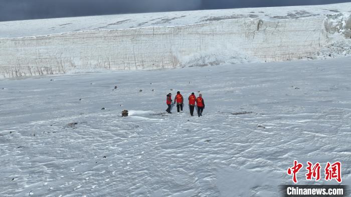 1月24日,沙龍灘管護(hù)站管護(hù)員們正在白茫一片的八一冰川進(jìn)行巡護(hù)。中新社記者 趙凜松 攝