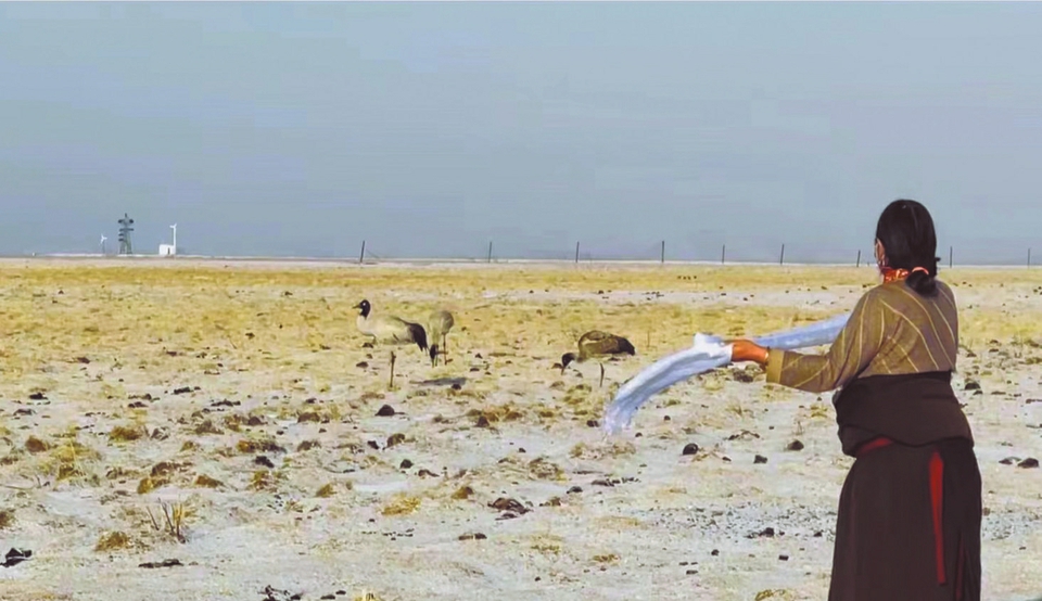 如科分享的視頻顯示,3月13日,雪后的若爾蓋銀裝素裹,獵獵的風吹動著如科房上的旗幟,四只黑頸鶴在黃色的草堆旁游走覓食。由他們精心照料的黑頸鶴夫婦,攜帶著兩只逐漸長大的小鶴,成為今年首批回到若爾蓋濕地的種群。按照往年的慣例,如科的妻子為遠道而來的“親人”送上哈達(如圖),歡迎它們回歸花湖。