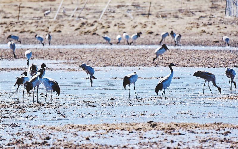 2024年3月1日,第一批飛回來的黑頸鶴出現(xiàn)在大雪后的濕地中。謝宏程 攝