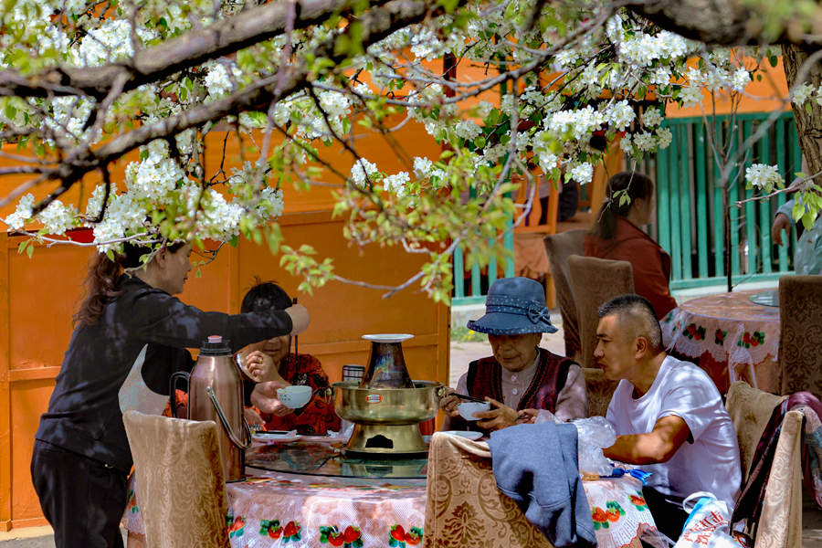 游客在梨花盛開(kāi)的農(nóng)家樂(lè)內(nèi)聚餐。新華網(wǎng) 黃開(kāi)森 攝