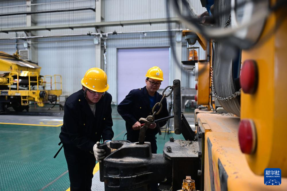 4月25日,中國鐵路青藏集團(tuán)有限公司西寧工務(wù)機(jī)械段職工在檢查車鉤。新華社記者 張龍 攝