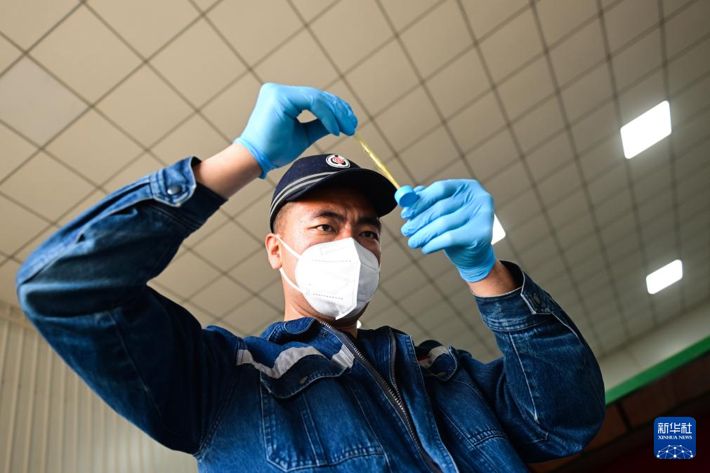 4月25日,中國鐵路青藏集團(tuán)有限公司西寧工務(wù)機(jī)械段職工在提取油樣。新華社記者 張龍 攝