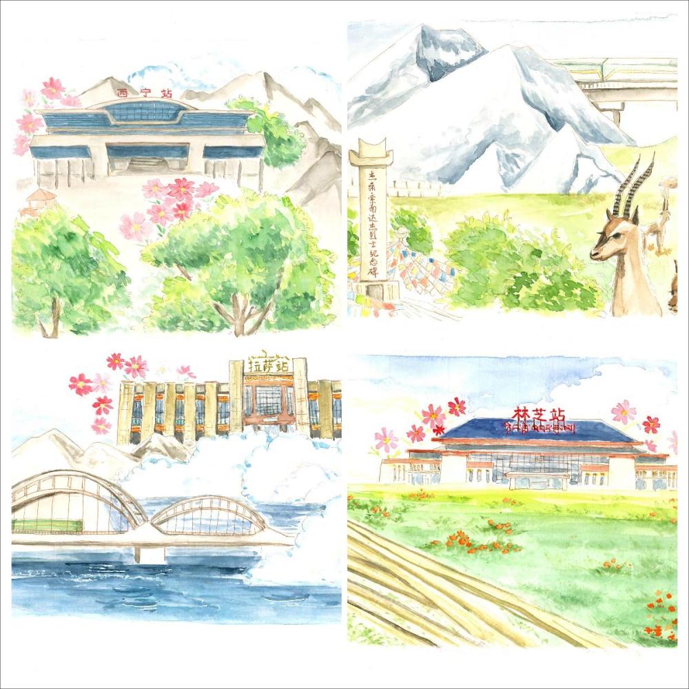 2023年,一組“魅力青藏、幸福天路”的水彩畫讓周源“火出圈”,從西寧站到林芝站,從丹噶爾古城到林芝的桃花林,長(zhǎng)長(zhǎng)的鐵軌將沿線的景觀特色串聯(lián)起來,構(gòu)成一幅美輪美奐的天路長(zhǎng)圖。
