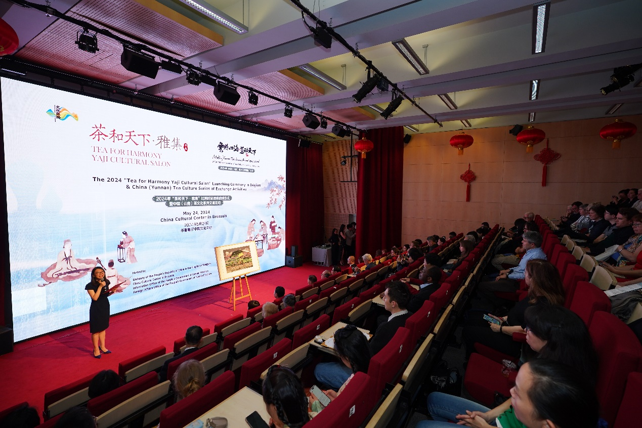 這幅作品由中國著名藝術(shù)家賀昆創(chuàng)作,通過木板套刻和層層渲染,鐫刻了全球首個茶主題世界文化遺產(chǎn)“普洱景邁山古茶林文化景觀”人、茶、林共生的美好畫面。當?shù)貢r間5月24日,在布魯塞爾中國文化中心舉辦的“茶和天下·雅集”比利時站活動啟動儀式暨中國(云南)茶文化系列交流活動上,現(xiàn)場揭幕了這幅來自云南的作品。