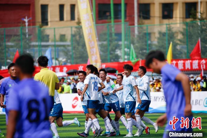 圖為比賽現(xiàn)場(chǎng),海北祁連山藏羊隊(duì)(白衣)慶祝進(jìn)球。馬銘言 攝