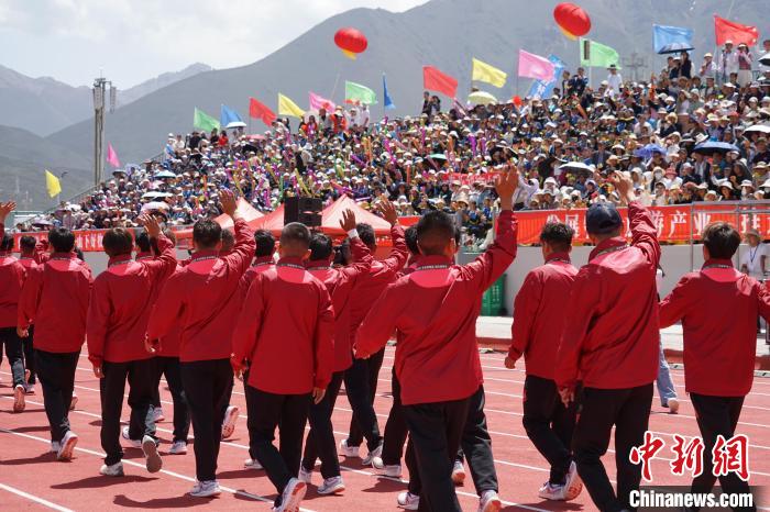 圖為海北祁連山藏羊隊(duì)隊(duì)員入場(chǎng)和觀(guān)眾揮手致意。馬銘言 攝