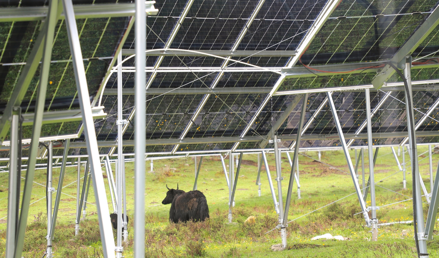 為打消顧慮,項目方探索起“牧光互補”模式,即建設(shè)的光伏板不低于地面1.8米,最高處是2.2米,能實現(xiàn)在光伏板上發(fā)電,板下放牦牛,做到“一草兩用,發(fā)展共贏”。同時,項目方還提前一年在基地建了一塊分布式光伏發(fā)電“試驗地”進(jìn)行驗證。
