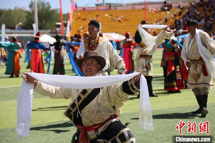 圖為民眾身穿民族服飾、手捧哈達(dá)。中新社記者 張?zhí)砀?攝