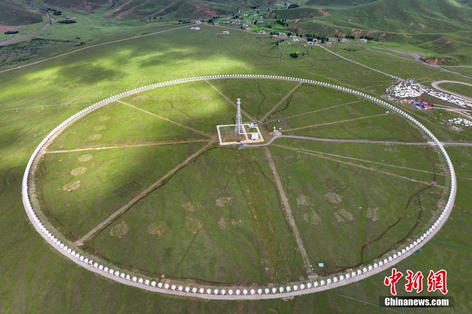 7月22日,四川稻城縣,草原上的圓環(huán)陣太陽(yáng)射電成像望遠(yuǎn)鏡。(無(wú)人機(jī)照片)中新社記者 劉忠俊 攝