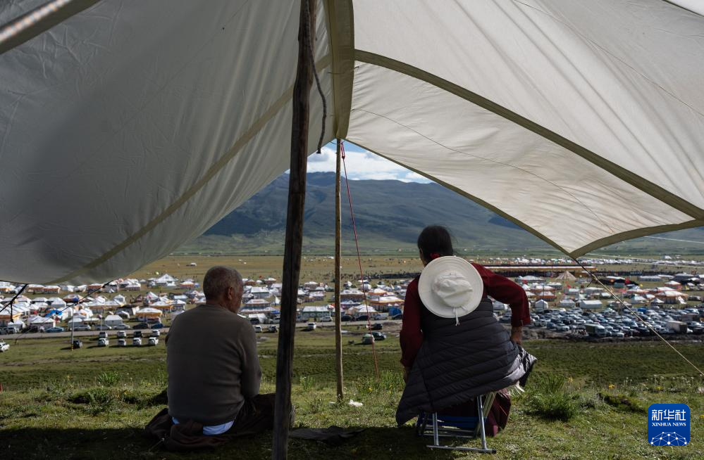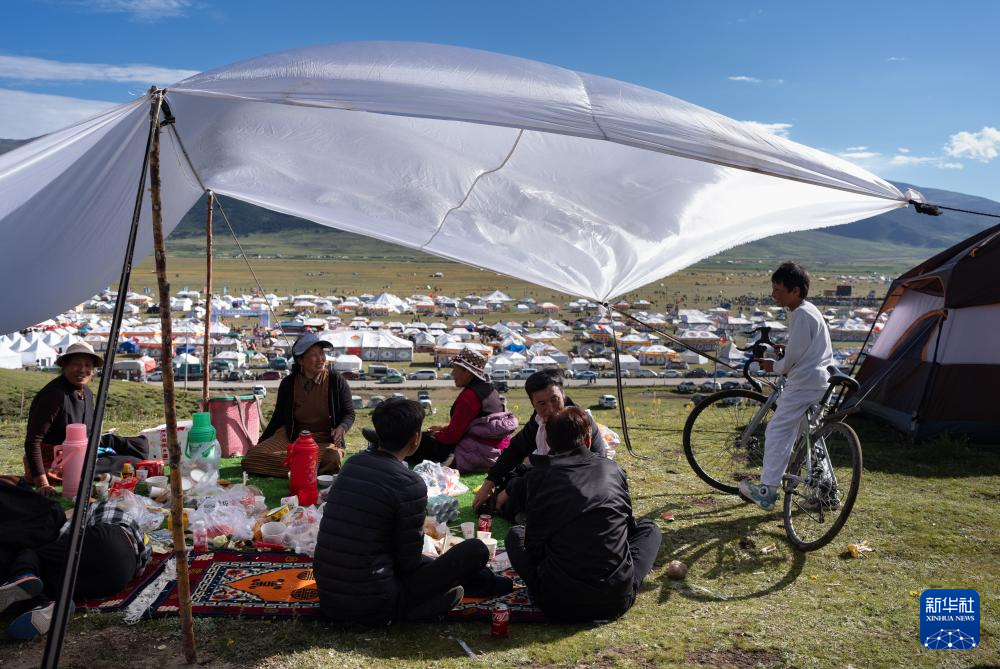 在四川省甘孜藏族自治州理塘縣多旺塘,人們在草原上支起天幕烤肉(7月31日攝)。新華社記者 江宏景 攝