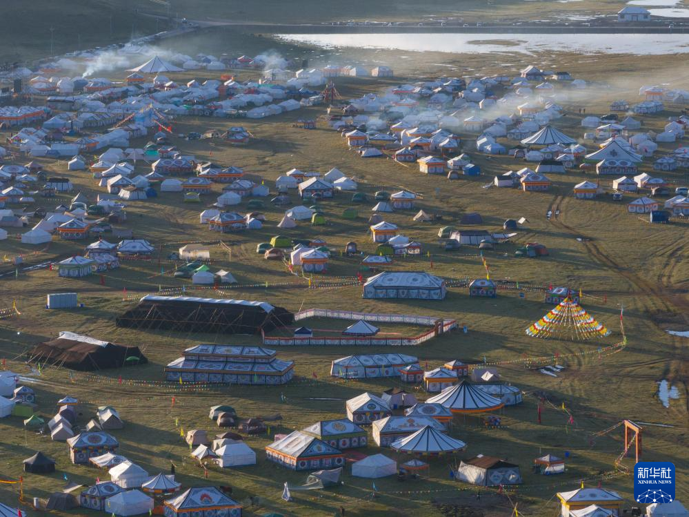 在四川省甘孜藏族自治州理塘縣多旺塘拍攝的草原上的“帳篷城”(7月31日攝,無人機照片)。新華社記者 江宏景 攝