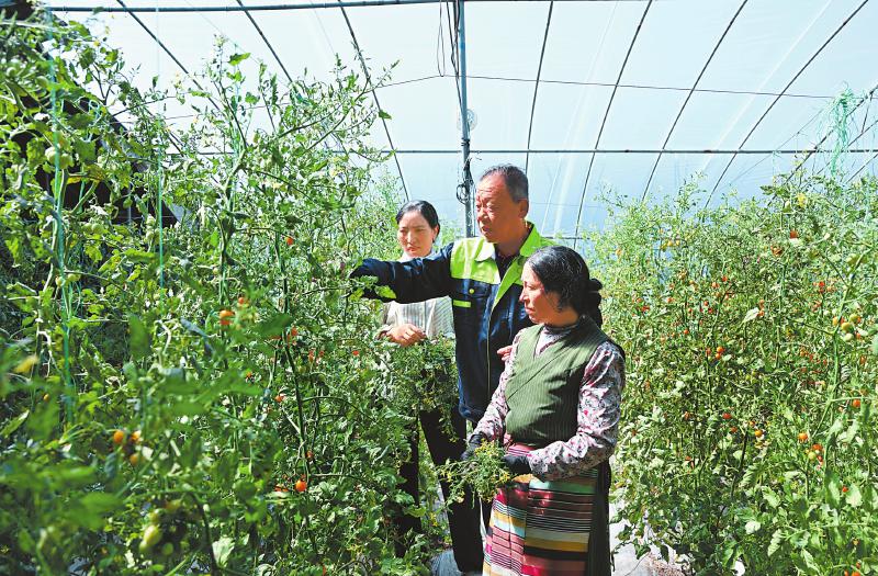 在瑪吉阿米花園農莊的大棚內,山東壽光來的劉振國(中)在指導栽培技術。四川日報全媒體記者 肖雨楊 攝