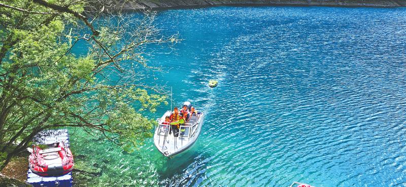 科研團(tuán)隊(duì)成員乘巡邏船在九寨溝長(zhǎng)海開展測(cè)量工作。韋維 攝