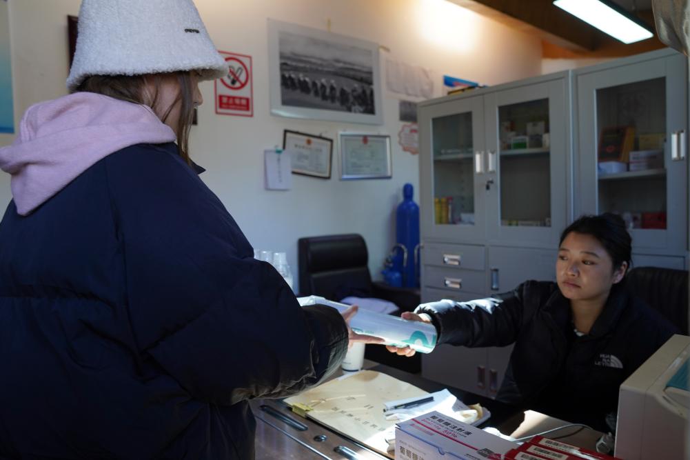 10月31日,在四川省甘孜藏族自治州稻城亞丁景區(qū),工作人員在“亞丁驛站”為游客倒熱水。新華社記者 儲加音 攝