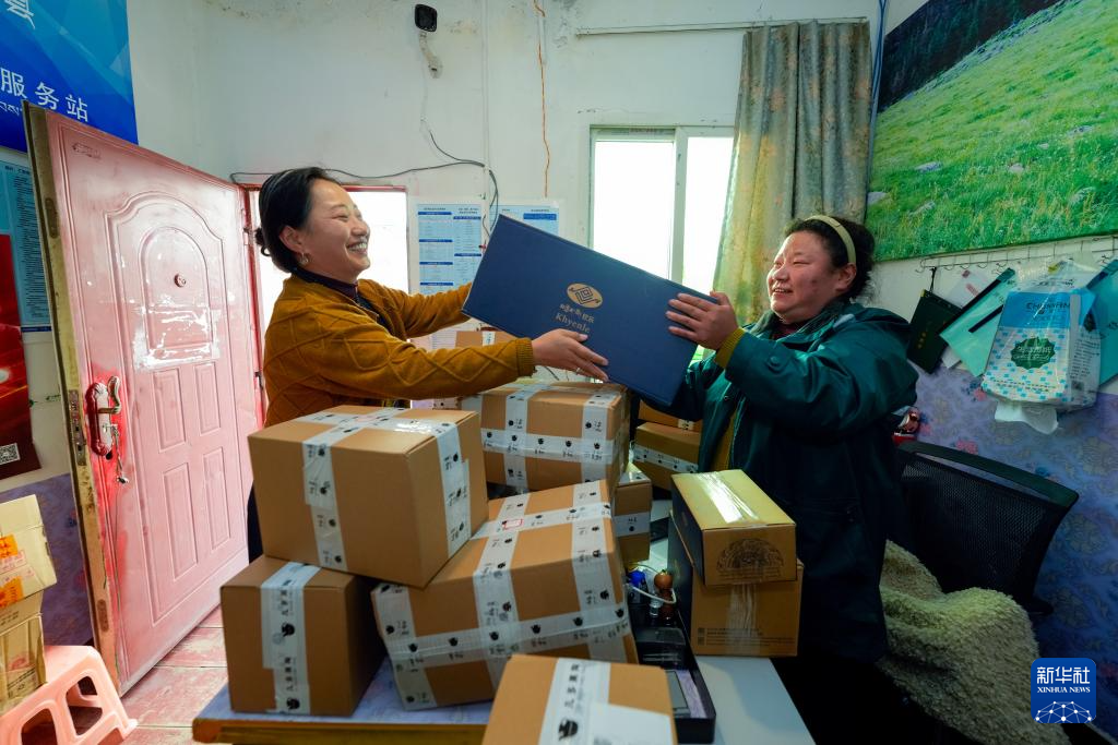 達瓦卓瑪(左)在家附近的郵政物流快遞服務站郵寄訂單貨品(11月4日攝)。新華社記者 沈伯韓 攝