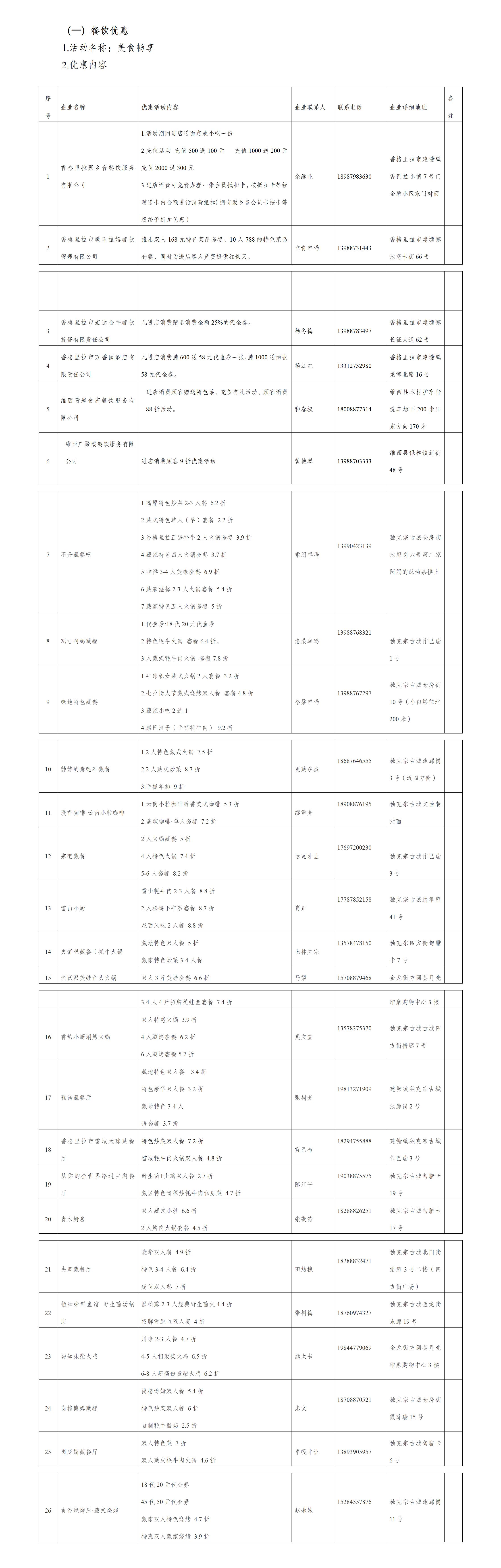 為熱烈迎接香格里拉的冬季旅游市場(chǎng)消費(fèi)客群,迪慶商務(wù)部門(mén)在動(dòng)車開(kāi)通一周年之際特別推出一系列“吃、住、購(gòu)”的優(yōu)惠政策。6家線上特色餐飲企業(yè)及20家古城精選餐飲業(yè)將提供2.2折至9.2折的超值優(yōu)惠,同時(shí)發(fā)放各類優(yōu)惠券;19家優(yōu)質(zhì)線上住宿企業(yè)及州內(nèi)百余家民宿將提供8折至8.5折的住宿優(yōu)惠;10余家迪慶特色產(chǎn)品的生產(chǎn)銷售企業(yè)推出滿減折扣優(yōu)惠、享受贈(zèng)品的優(yōu)惠福利,讓廣大游客樂(lè)游香格里拉提升旅游體驗(yàn)。