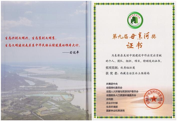 圖為西藏自治區(qū)水土保持局獲得“第九屆母親河優(yōu)秀組織獎(jiǎng)”獲獎(jiǎng)證書。