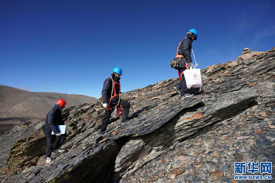 在西藏山南市洛扎縣,國家電網(wǎng)山南供電公司輸電運(yùn)檢中心員工龔朝偉(右)和國家電網(wǎng)安徽省電力有限公司援藏工作人員徐四勤(中)、吳寅(左)向浪洛線197號(hào)鐵塔前進(jìn)(2020年11月4日攝)。新華社記者詹彥 攝