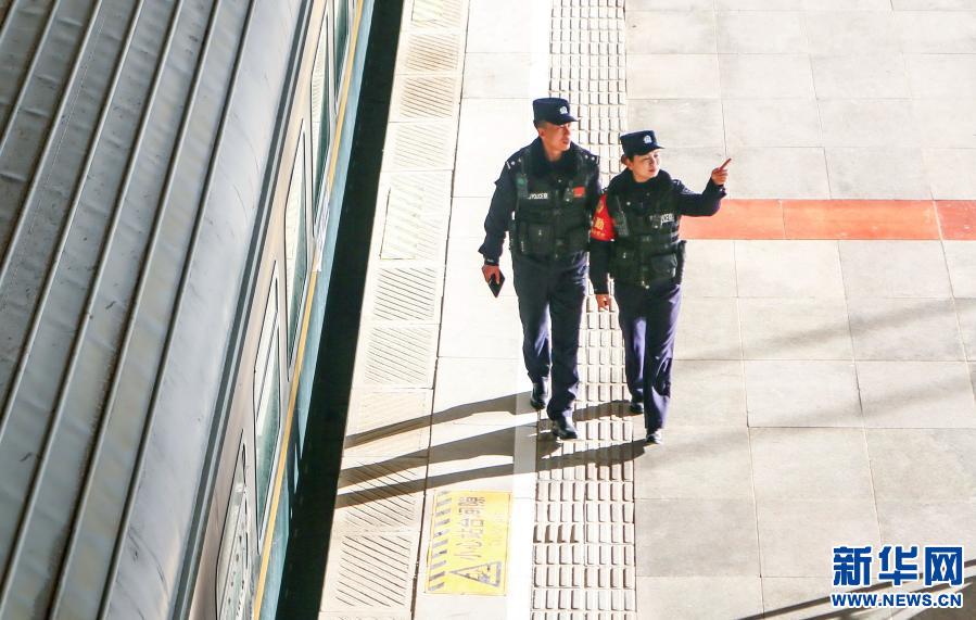 1月10日,“女子格?;ā本M民警雷穎君(右)與同事在火車站里巡邏。新華社發(fā)(胡安鵬、黃飛攝影報(bào)道)