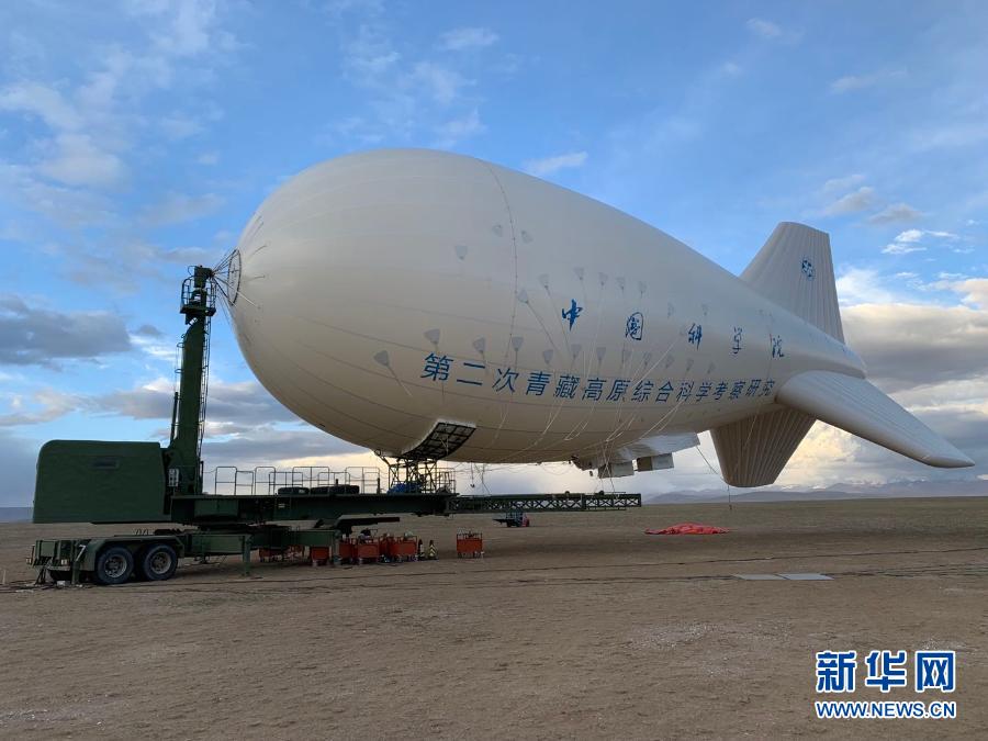 2019年5月30日在中科院青藏所納木錯多圈層綜合觀測站的觀測營地拍攝的“極目一號”浮空器。新華社記者 田金文 攝
