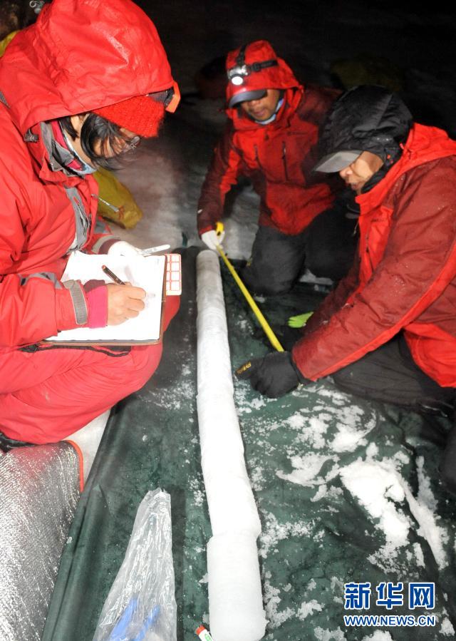 2017年7月1日,第二次青藏高原綜合科考冰川與環(huán)境變化考察隊前往龍匣宰隴巴冰川末端鉆取冰芯。這是科考隊員丈量、標(biāo)記、裝封冰芯。新華社發(fā)(索朗羅布 攝)