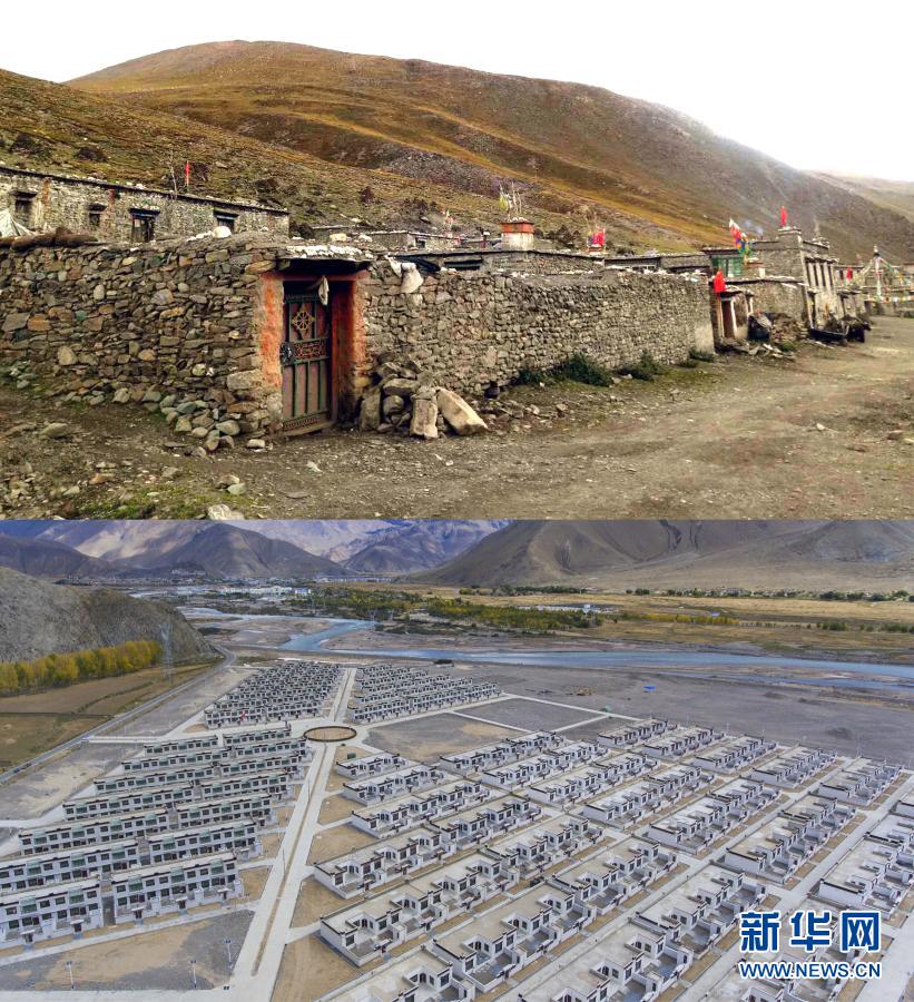 拼版照片:上圖是曾經(jīng)的西藏日喀則市拉孜縣查務(wù)鄉(xiāng)民房(資料照片);下圖是西藏日喀則市南木林縣孔阿村易地搬遷點(diǎn)(2018年9月28日南木加攝,無(wú)人機(jī)照片 )新華社發(fā)