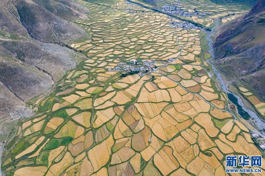 位于拉薩河谷的青稞田(2020年9月9日攝,無人機(jī)照片)。新華社記者 普布扎西 攝