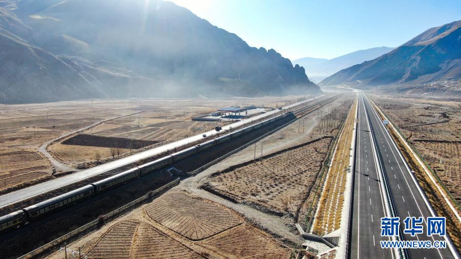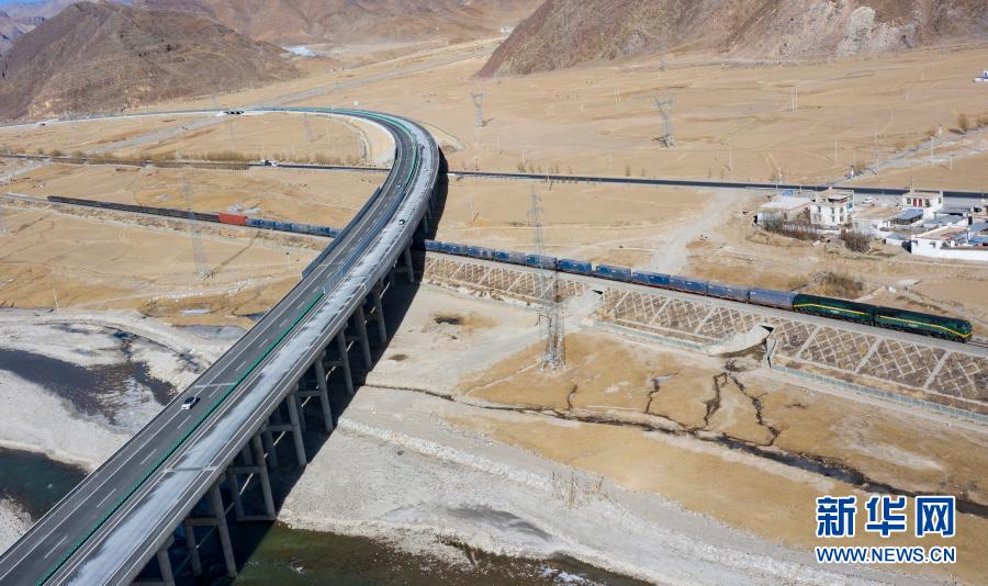 這是拉薩至那曲高等級公路和青藏鐵路沿線風(fēng)光(1月28日攝,無人機(jī)照片)。新華社記者 普布扎西 攝