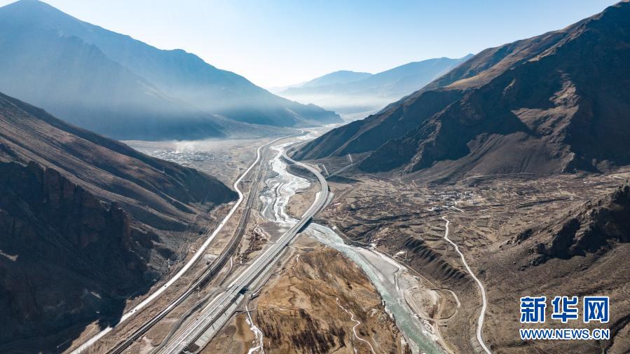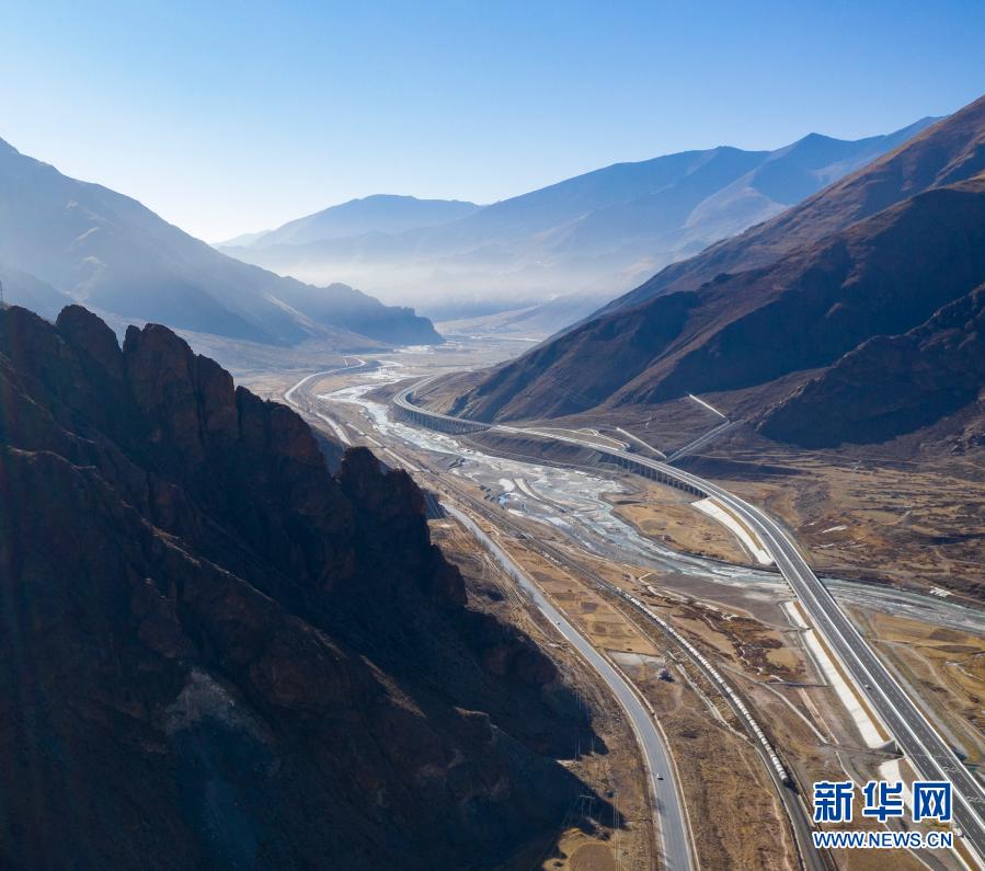 這是拉薩至那曲間的交通線路(1月28日攝,無人機(jī)照片)。從左到右依次為109國道、青藏鐵路、高等級公路、鄉(xiāng)村公路。新華社記者 晉美多吉 攝