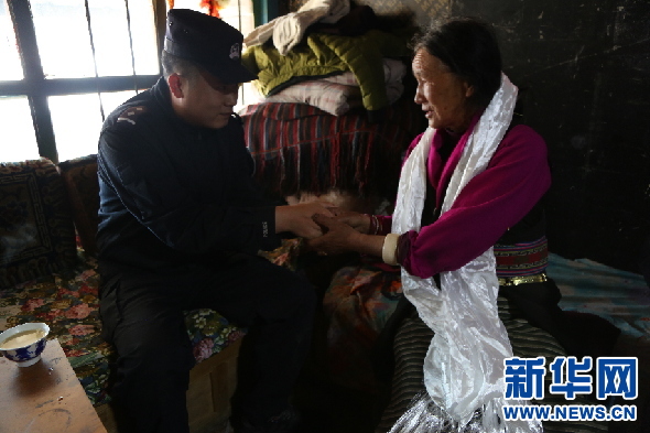 西藏出入境邊檢總站執(zhí)法調(diào)查支隊四隊民警在卓瑪老人家中慰問(3月4日攝)。新華網(wǎng)發(fā) 羅云川攝
