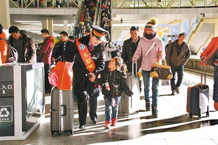 圖為拉薩市火車站工作人員幫助旅客進(jìn)站