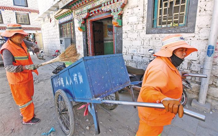 圖為拉薩市城關(guān)區(qū)環(huán)衛(wèi)工人在清掃街道